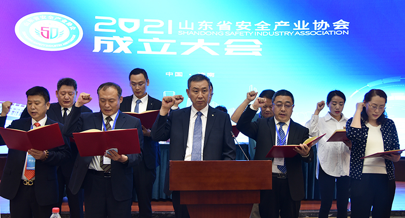 山東省安全產(chǎn)業(yè)協(xié)會第一屆理事會會長徐介綱帶領(lǐng)副會長單位宣讀宣誓